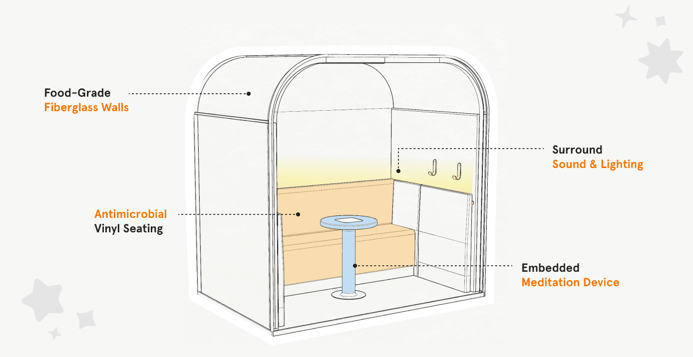 Using user-controlled sound and lighting, the pod can become a personal immersive experience.